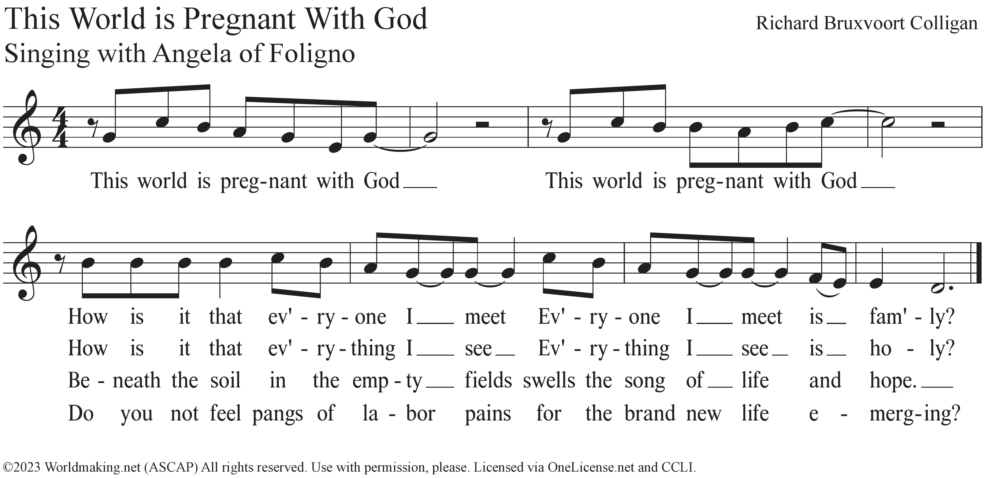 Picture her sputtering in awe when you imagine Saint Angela of Foligno singing, "This world is pregnant with God." It's a powerful feminine metaphor for change. Sing it in Springtime, either Lent or Eastertide, on Earth Day, or any moment to remember humankind's interconnection with creation.