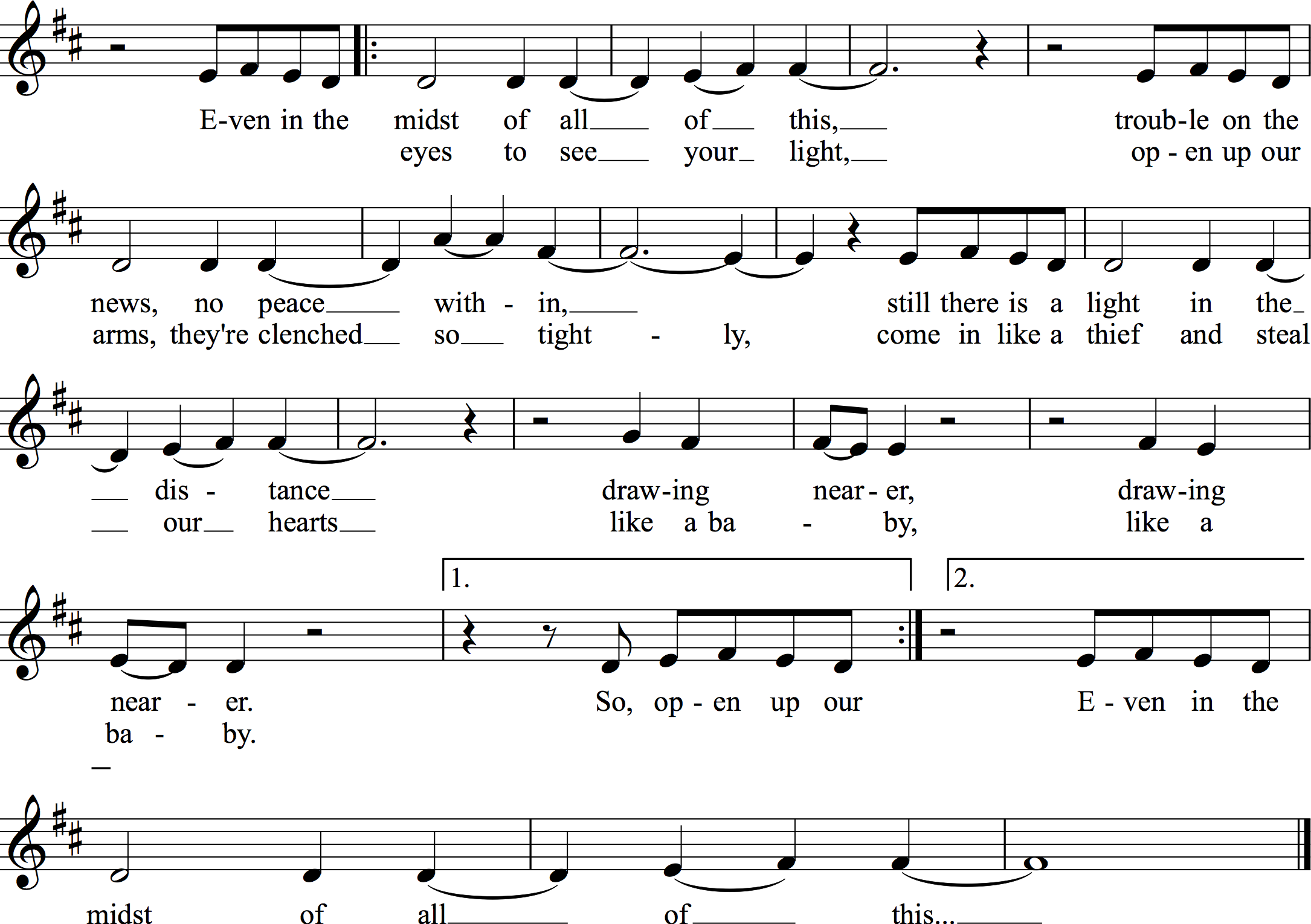 In the midst of all the difficulties of our present time, this Advent song looks toward Christmas with hope. A laid back folk/pop chorus, it was written for Advent rites of candle lighting. Easy to play on guitar or keyboard, the song can also be used with a full band.
