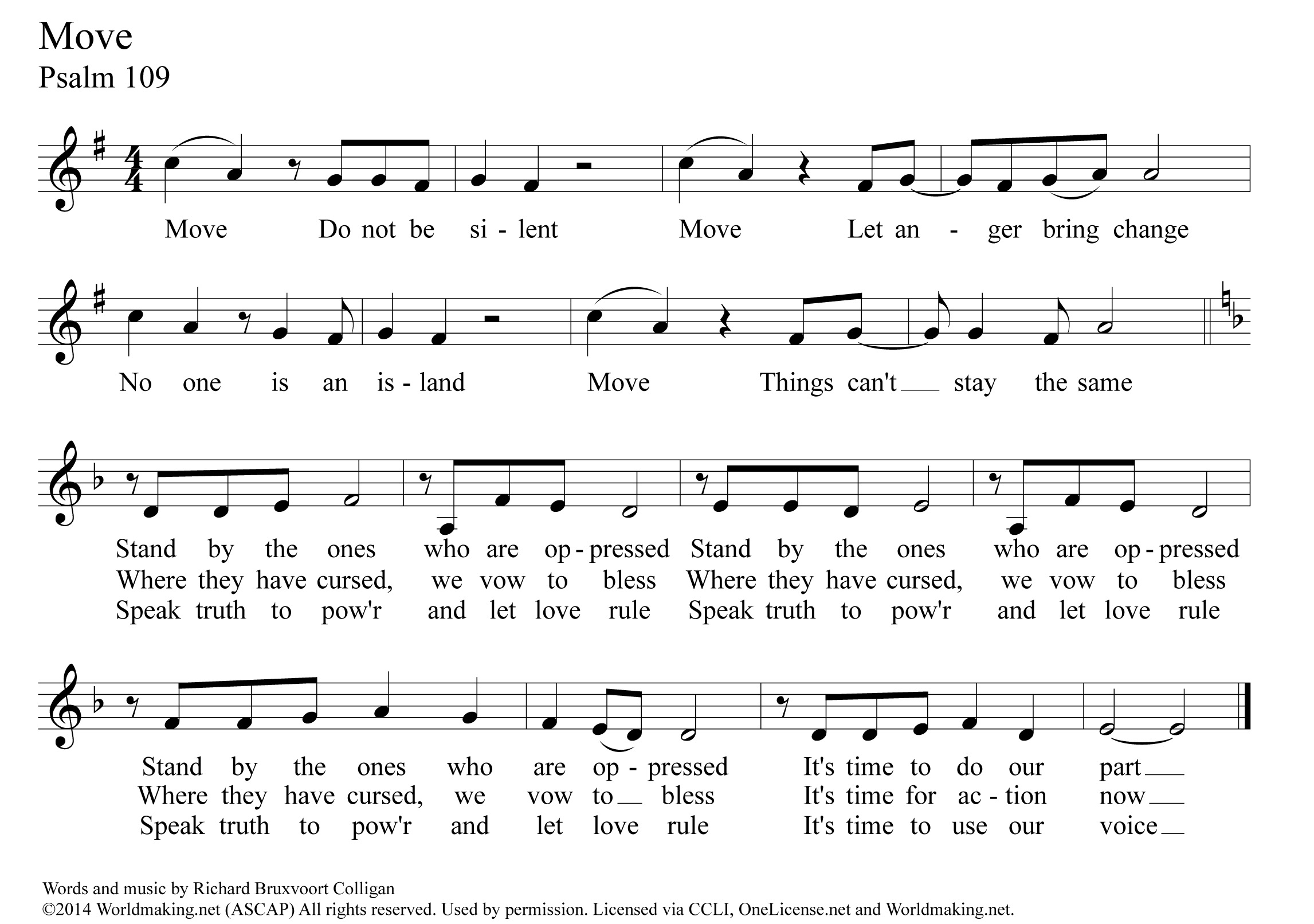 This song is a reflection on Psalm 109, one of the most angry psalms. The song "Move" invites focused commitment to be active in the work of protest, healing and justice. It also names anger as a natural response to oppression, perhaps a good fuel for change.